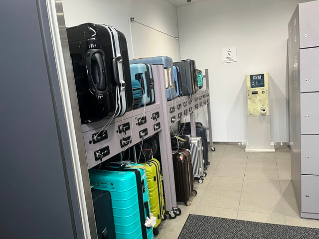 スーツケースなどの大きな荷物はチェーンにつないで置く場所がありますが、少ないのでできれば身軽で行った方がよさそうです。(写真は出る時の14時過ぎの状況)