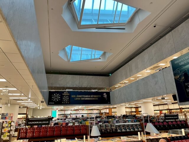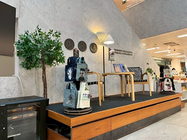 書店内にある椅子やランプが可愛いく、アアルトがデザインしたアルテックの家具のようでした。