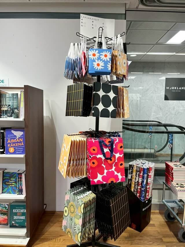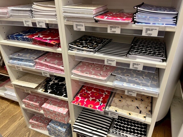 マリメッコの紙袋・ラッピングペーパー・ノートなどの文房具も充実していました。