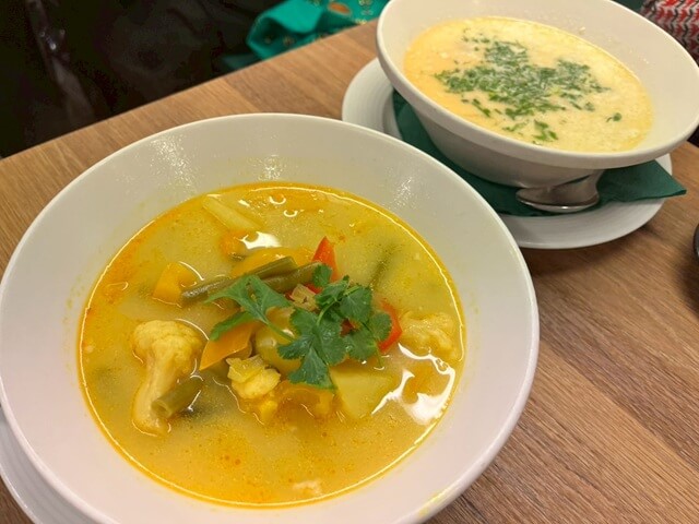 サーモンクリームスープはまろやかで、カレースープは野菜がごろごろ入っていて、さすがスープ専門店という高クオリティでした。
