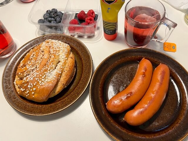 カフェエスプラナーディでテイクアウトしたシナモンロールとソーセージを朝食にしました。