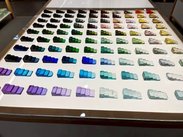 ガラスの色見本は濃さで全然イメージが変わるのが面白いですね。