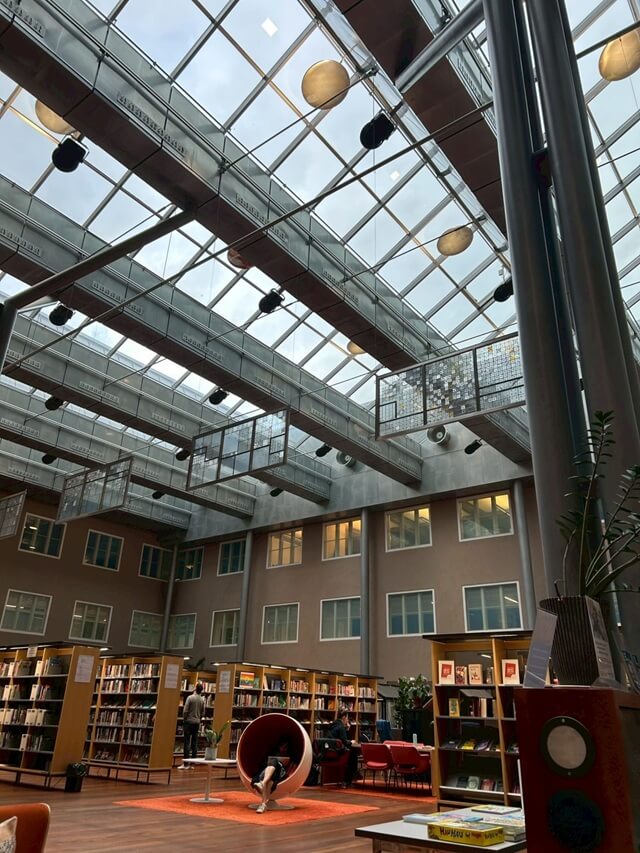 同じ建物内に図書館があり、天井がガラスで開放感たっぷり。