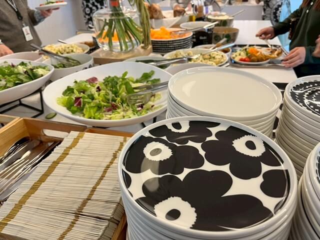 サラダバーの奥にメインを受け取る場所と飲み物(コーヒー・紅茶・)とデザート(いちごヨーグルト)を取る場所があるので、見逃さないようにしましょう。