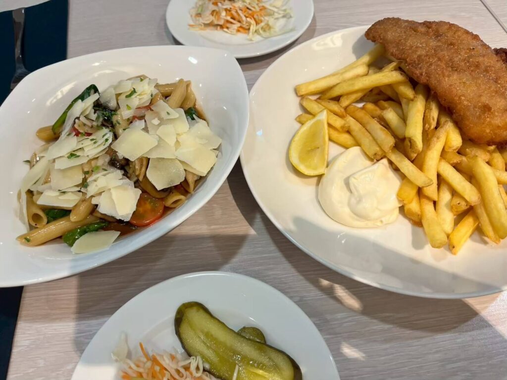 夕飯はカフェテリアみたいなところで、ペンネとフィッシュアンドチップスを注文。